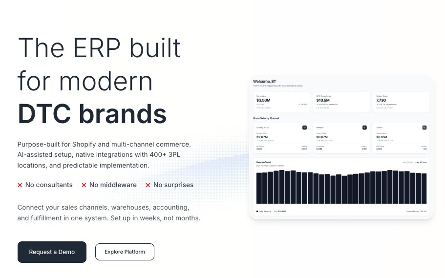Fulfil is an ERP built for modern DTC brands. Purpose-built for Shopify and multi-channel commerce. AI-assisted setup, native integrations with 400+ 3PL locations, and predictable implementation.