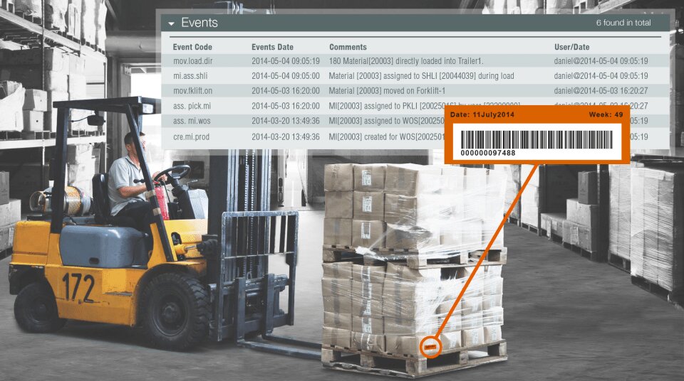 SOLOCHAIN leverages wireless mobile computers (handhelds, smartphones, wearable wrist mounts, vehicle mounts) to manage inbound, warehousing, kitting/manufacturing, and outbound processes, generating detailed event logs, including user, date, and timestamps based on inventory, containers, locations, orders, processes, tasks, etc.