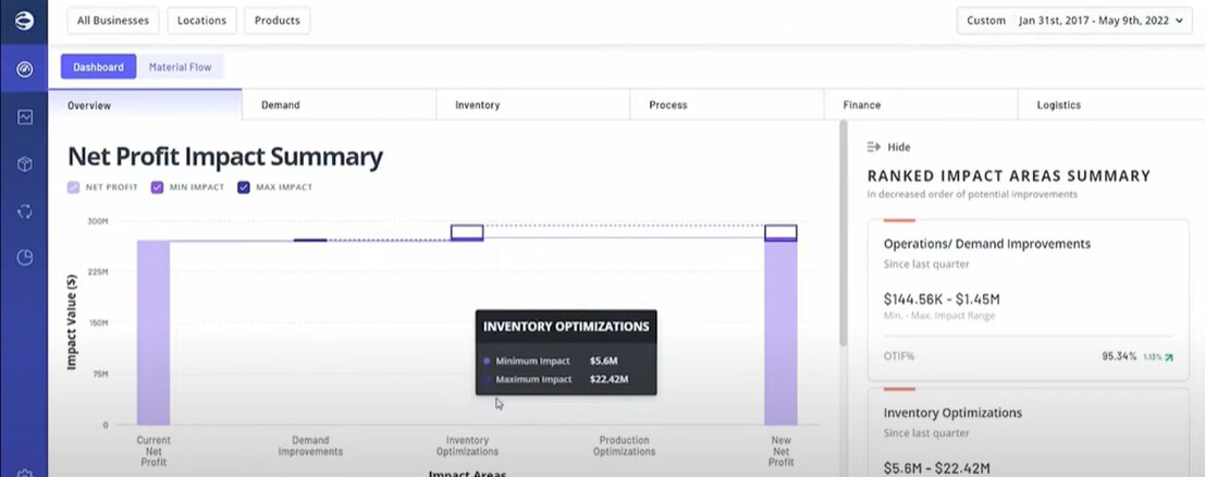 - Financial intelligence: Provides real-time analysis of supply chain decisions' financial impact, helping businesses prioritize strategies that accelerate free cash flow and improve return on investment